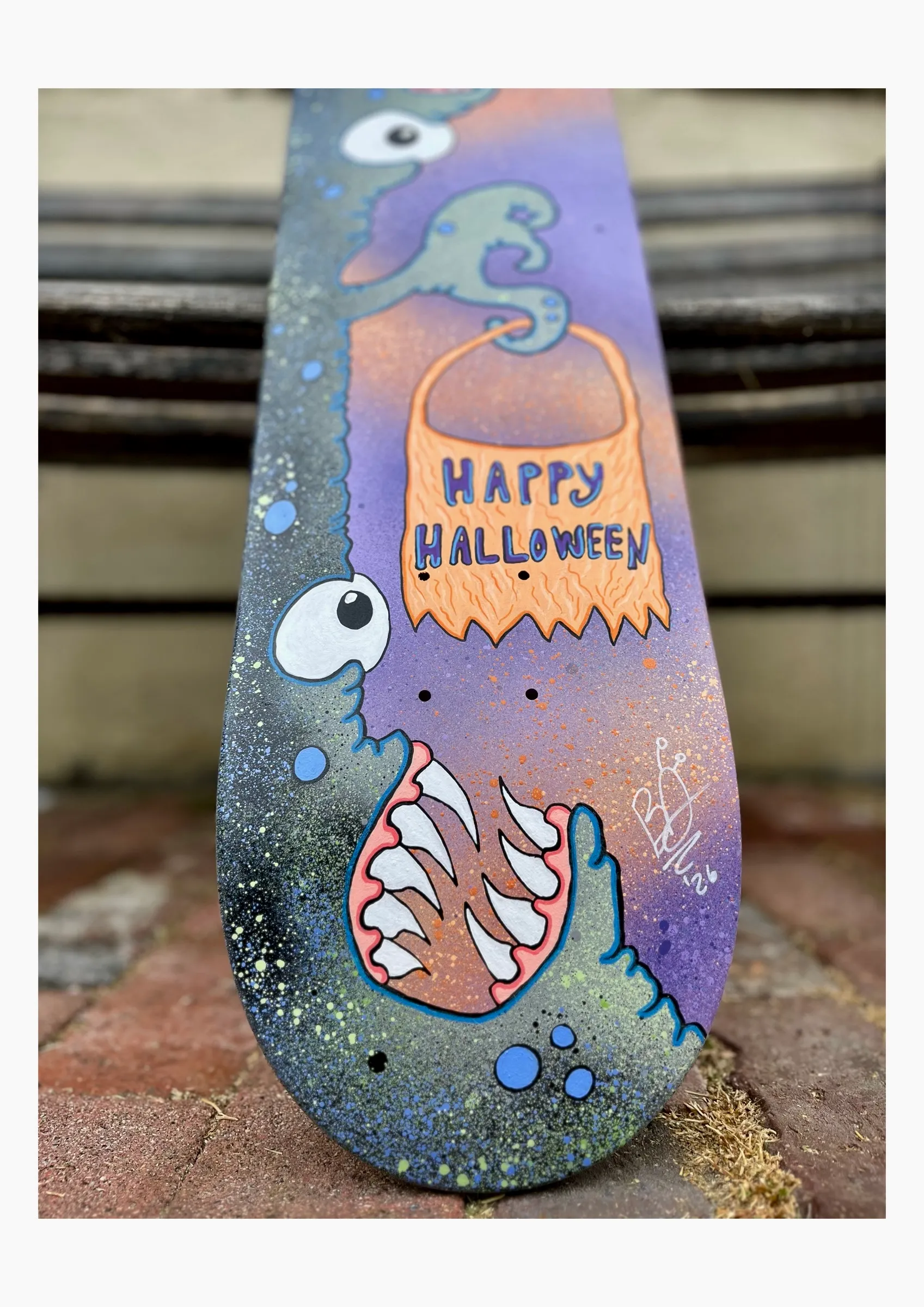 Original hand painted skateboard made by ME! Spray painted background with acrylic paint art on top. One of a kind! The dimensions for these pieces are 7.75 X 31.5. Hope to see it hanging on a wall as an art piece or skateboarding around the town! 👽